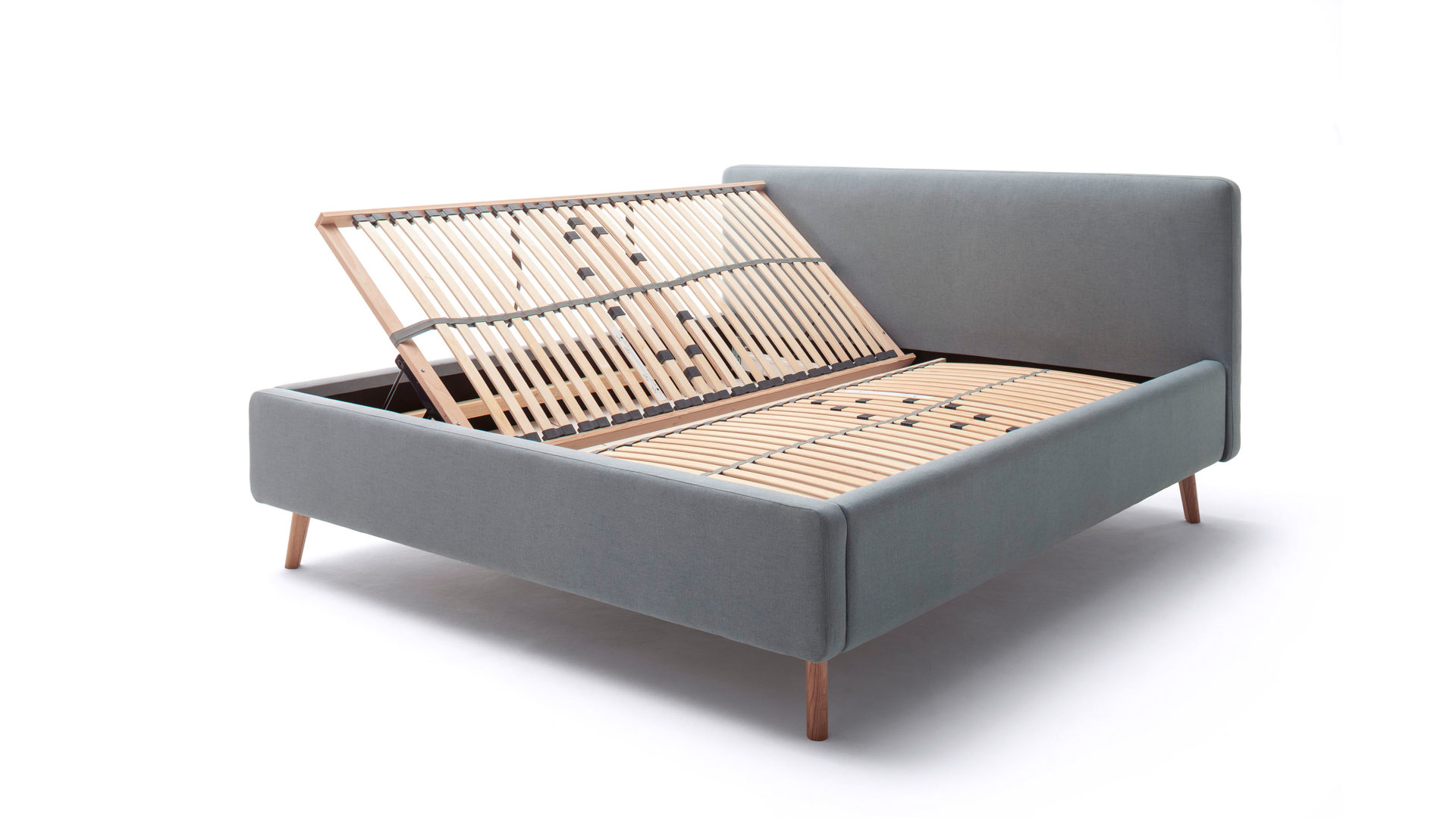 Im Lieferumfang des Bettgestells sind zwei hochwertige Lattenrahmen enthalten, die jeweils 28 Federholzleisten mit Härtegradverstellung aufweisen. Klappen Sie die Lattenrahmen seitlich hoch, um sich Zugang zu den Bettkästen mit Gasdruckdämpfer zu verschaffen. In den geräumigen Kästen können Sie etwa Bettzubehör wie Kissen und Decken sowie viele sonstige Utensilien praktisch platzsparend aufbewahren.