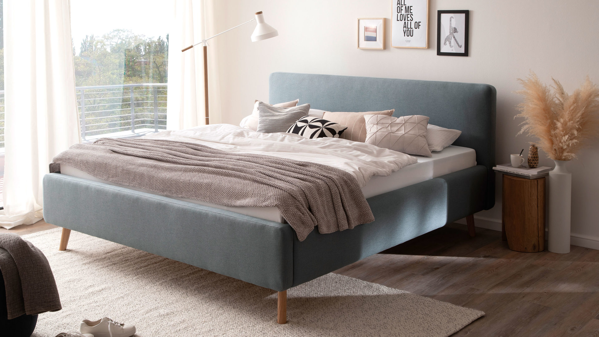 Das Polsterbettgestell Mattis begeistert durch die elegante Optik sowie die hervorragende Material- und Verarbeitungsqualität. Es kombiniert einen eisblauen Flachgewebe-Bezug mit eichefarbenen Holzfüßen. Sowohl die Bettseiten als auch das Polsterkopfteil sind glatt bezogen. Letzteres lädt Sie ein, sich anzulehnen, wenn Sie abends im Bett vor dem Schlafen noch fernsehen oder in einem Buch lesen.