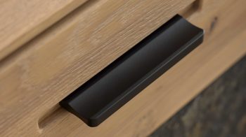 Besondere Akzente setzen die Details aus grauem Parsolglas sowie die sichtbare Front- und Rückwand mit Steinfurnier in Granit-Steinoptik. Diese Kombination aus warmem Holz und kühler Steinoptik verleiht der Vitrine Tiefe und Ausdruck. Ergänzt durch mattschwarz lackierte Aluminiumgriffe entsteht ein Design, das Natürlichkeit und Urbanität perfekt vereint.