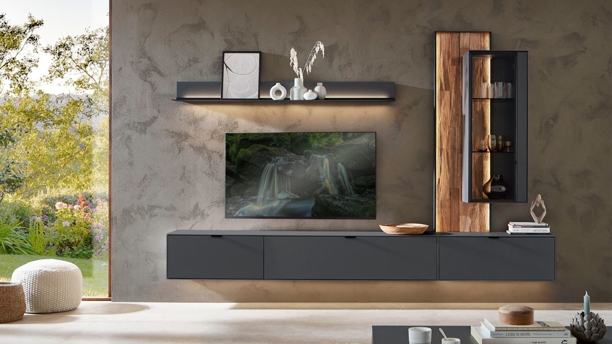 • Die Abbildung zeigt ein Wohnbeispiel, welches auch Dekoration sowie separat erhältliches Zubehör enthält. Im Lieferumfang enthalten ist ein Wandregal.