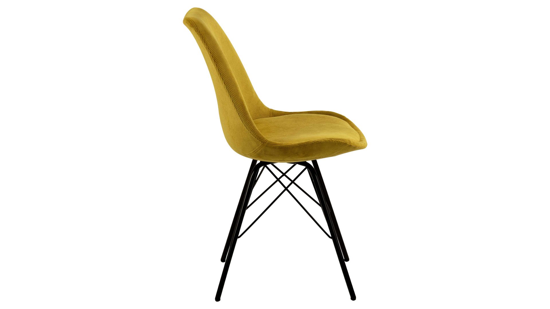Dieser Polsterstuhl verkörpert klassische Eleganz. Als stabile, dabei aber wunderbar filigran designte Basis fungiert ein mattschwarz pulverbeschichtetes Stahldrahtgestell. Darauf befindet sich eine gelbe Sitzschale aus robustem Kunststoff. Sie ist rundherum mit Feincord bezogen, ebenfalls in warmem Gelb. Der angesagte Feincordbezug überzeugt sowohl qualitativ als auch optisch und haptisch.