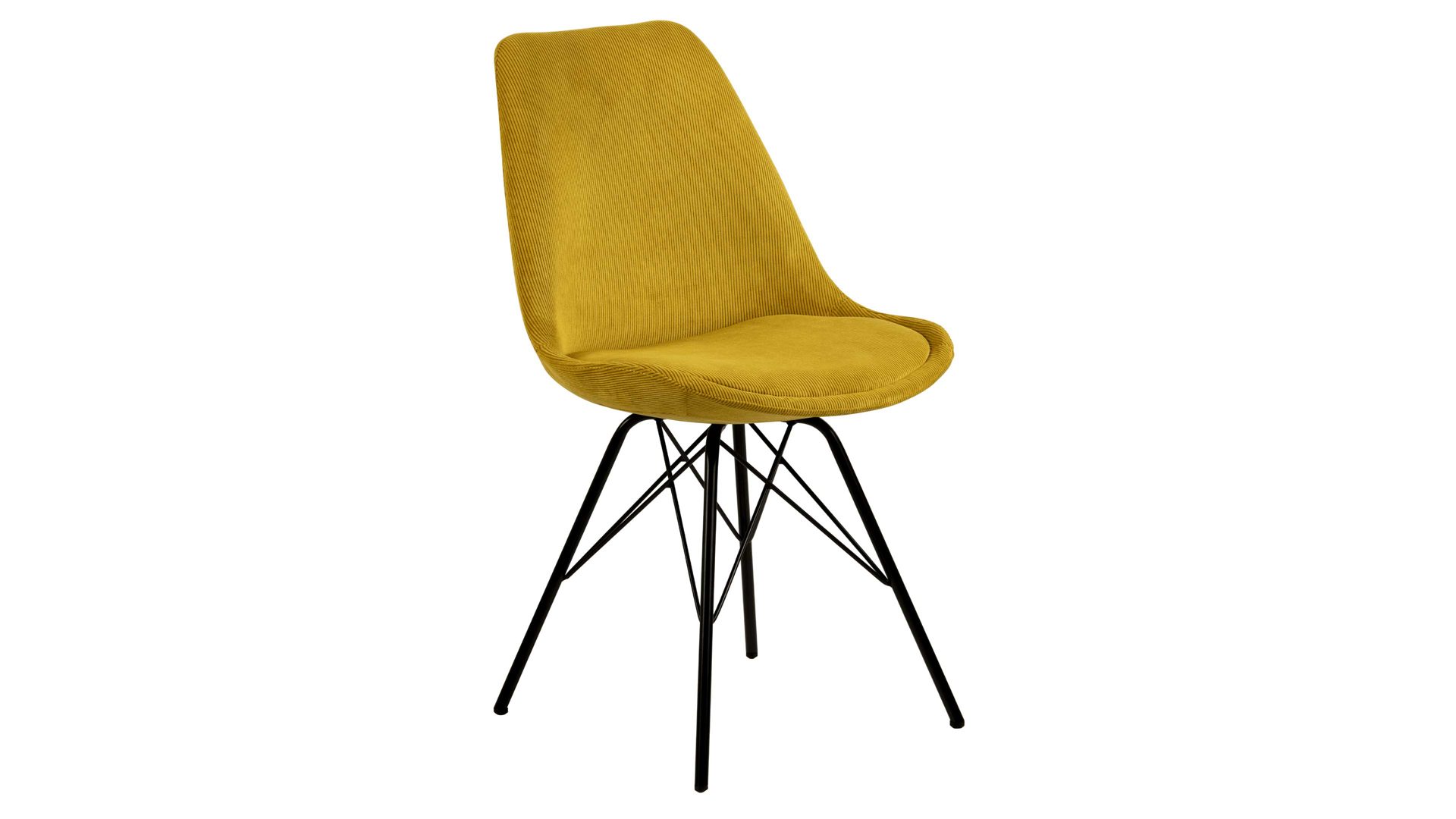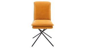Er kombiniert ein mattschwarz lackiertes Stativgestell aus robustem Eisen mit einem curcumafarbenem Mikrofaserbezug in Lederoptik und fügt sich in verschiedene Wohnstile harmonisch ein. Zu den optischen Highlights des Esszimmerstuhls gehört neben der Formensprache und den perfekt aufeinander abgestimmten Farben der markante Quereinzug im Rücken.