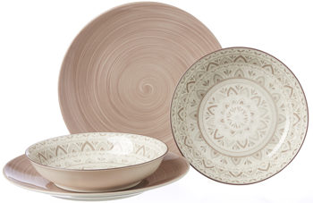 Bei diesem Kombiservice gehen hohe Qualität und kreativ-stilvolles Design Hand in Hand. Das Geschirr präsentiert sich in einem warmen, wohnlich-einladenden Braunton, akzentuiert durch Ornamente, die einerseits Verspieltheit und andererseits Harmonie ausstrahlen. Hergestellt ist das Essgeschirr aus erstklassigem Porzellan. Dank des edlen Materials und des charmanten Designs erscheint das Kaffeeservice sehr elegant.