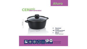 Fleischtopf Atura – Erweitern Sie Ihre Küche mit diesen hochwertigen Kochtöpfen aus Aluguss, die in drei praktischen Größen erhältlich sind. Diese Töpfe zeichnen sich durch eine innovative Keramikbeschichtung aus. Sie sorgt für eine gleichmäßige Hitzeverteilung und einen langanhaltenden Antihafteffekt, wodurch das Kochen besonders einfach und angenehm wird. Die Keramikbeschichtung und die robusten Griffe aus einem Guss gewährleisten maximale Stabilität. Nach dem Kochen lassen sich die Töpfe mühelos reinigen, sodass Sie mehr Zeit für die Dinge haben, die Ihnen wichtig sind. Diese Kochtöpfe sind die perfekte Ergänzung für Ihre Küche. Fleischtopf Atura inklusive Deckel, 24 cm Durchmesser.