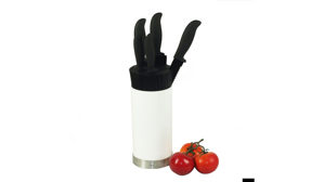 Praktisch und stilvoll zugleich: der Messerblock Acida von kela. Dieser beinhaltet fünf verschiedene qualitativ hochwertige Messer, von klein bis groß, die aus Edelstahl gefertigt sind. Der Messerblock ist aus weißem PP-Kunststoff gefertigt. Dieser hat zudem ein praktisches Innenleben, das einfach herausnehmbar ist. Die Messer sind durch dünne Kunststoff-Streifen im Messerblock voneinander getrennt und können somit nicht so leicht verkratzen. Maße ca. 11 x 23 cm (DxH) mit 1 x Chefmesser ca. 32 cm (L), 1 x Fleischmesser ca. 32 cm (L), 1 x Brotmesser ca. 32 cm (L), 1 x Ausbeinmesser ca. 24 cm (L), 1 x Küchenmesser ca. 20 cm (L)