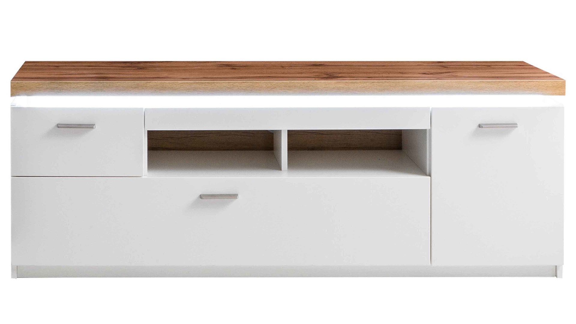 Highlights bilden die angenehme Dämpfung der Schubladen für lautloses Schließen und die Deckboden-Beleuchtung mit fest verbauten LED-Leuchtmitteln, die bereits inklusive ist und optisch wie funktional begeistert. Gegen Aufpreis lässt sich das TV-Möbel mit einer zusätzlichen LED-Beleuchtung und Funkfernbedienung ergänzen.