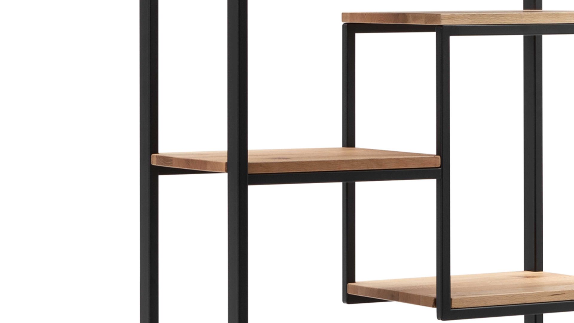 Das Bücherregal kombiniert ein stabiles Gestell aus geschwärztem Roheisen mit Böden aus massiver Balkeneiche, die strukturgehobelt und mit einer geölten Wachs-Effekt-Oberfläche versehen ist.