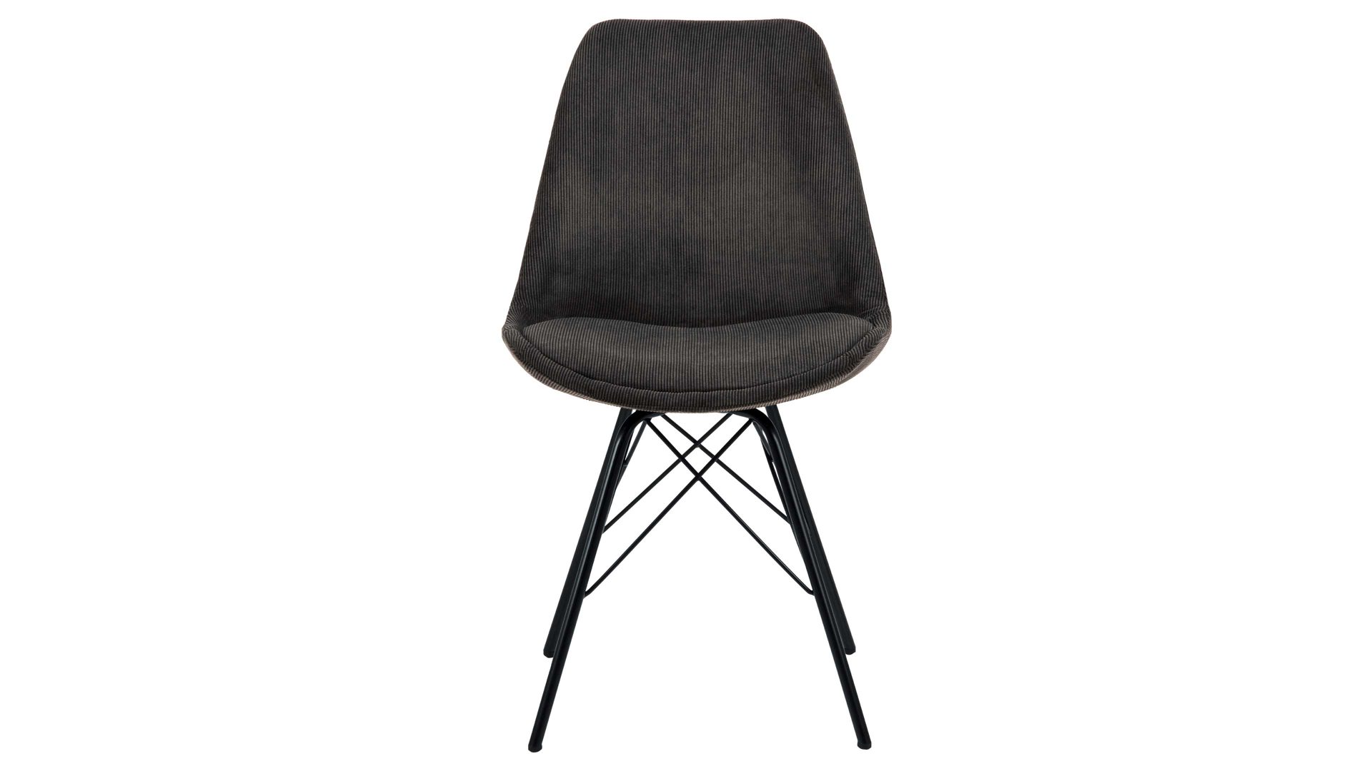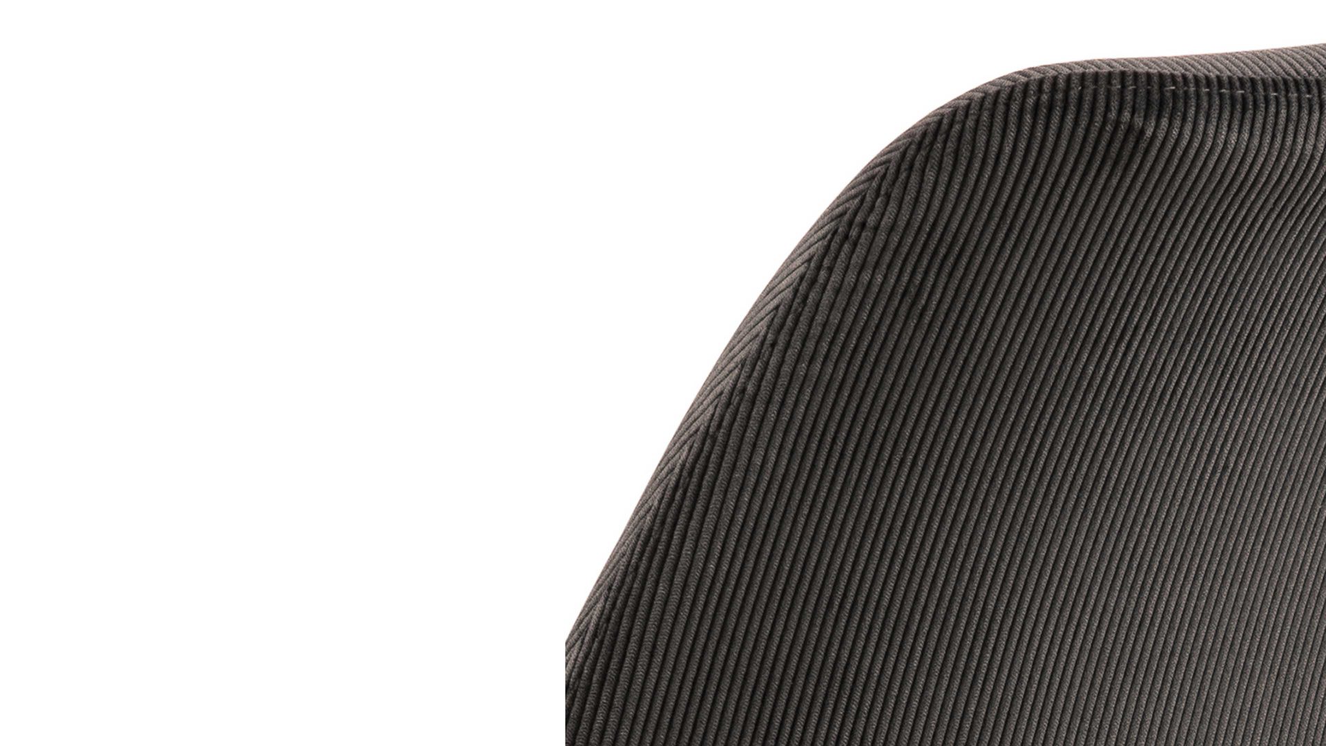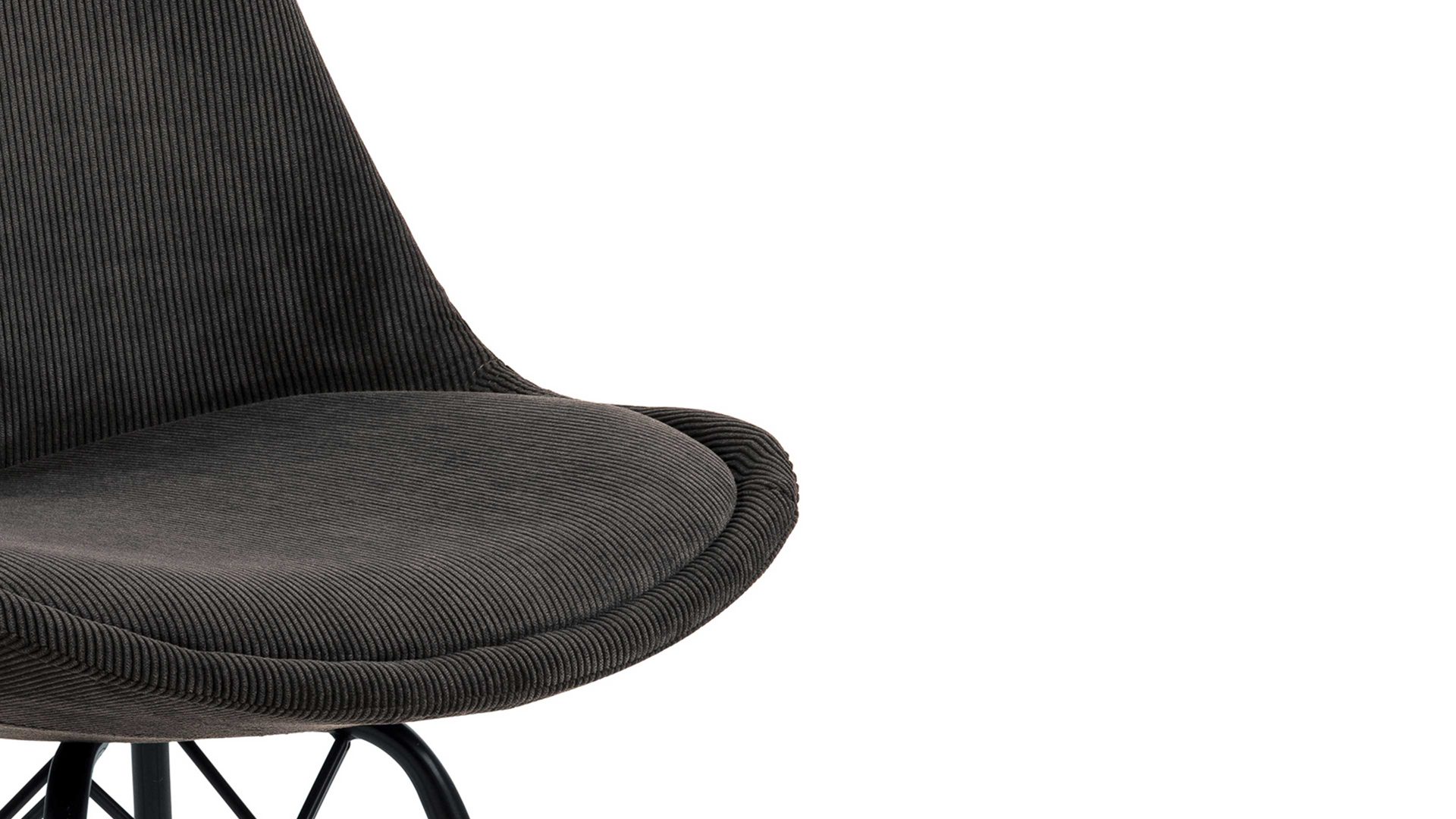 Als stabile, dabei aber wunderbar filigran designte Basis fungiert ein mattschwarz pulverbeschichtetes Stahldrahtgestell. Darauf befindet sich eine anthrazitfarbene Sitzschale aus robustem Kunststoff. Sie ist rundherum mit Feincord bezogen, ebenfalls in Anthrazit. Der angesagte Feincordbezug überzeugt sowohl qualitativ als auch optisch und haptisch.
