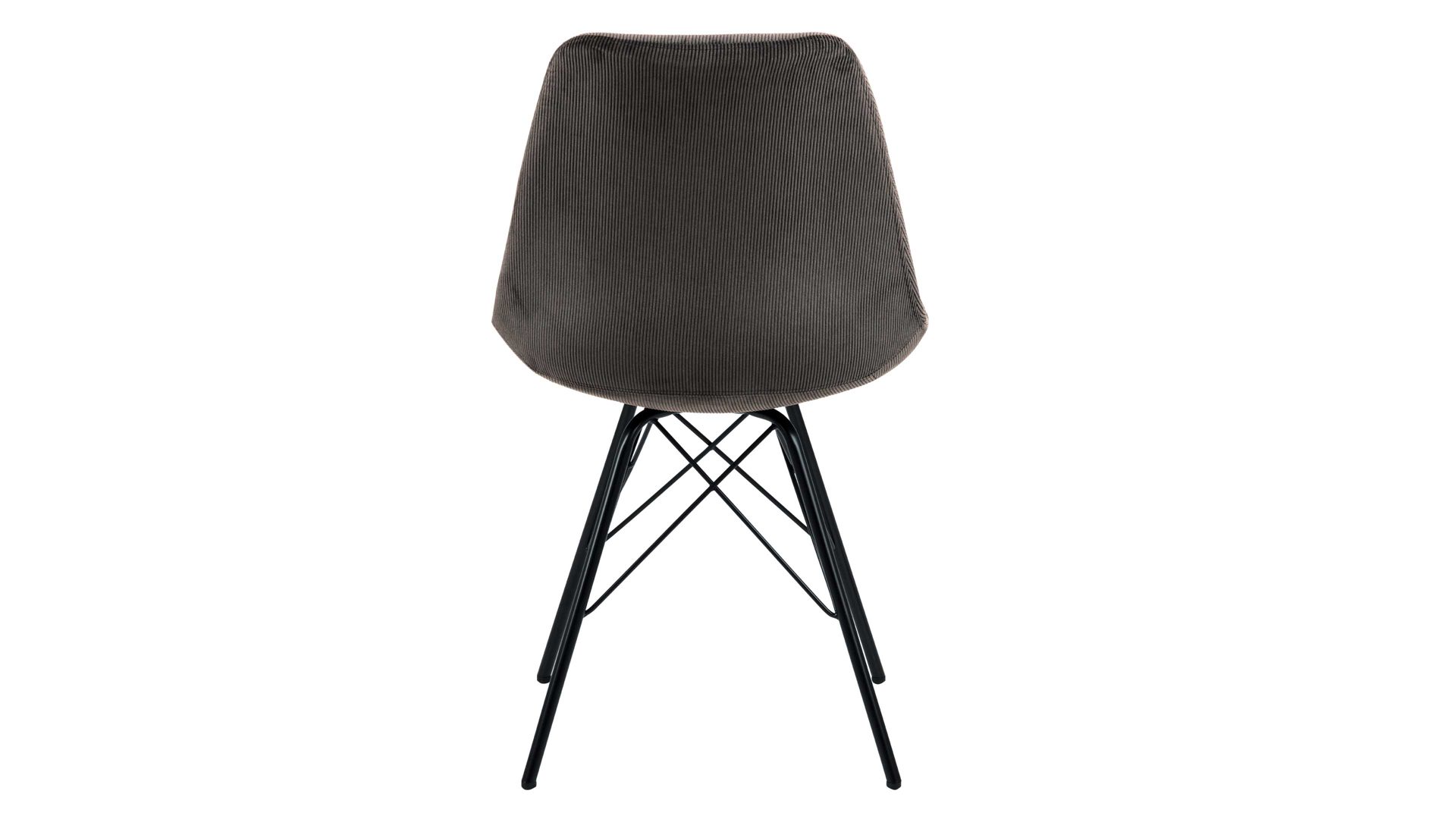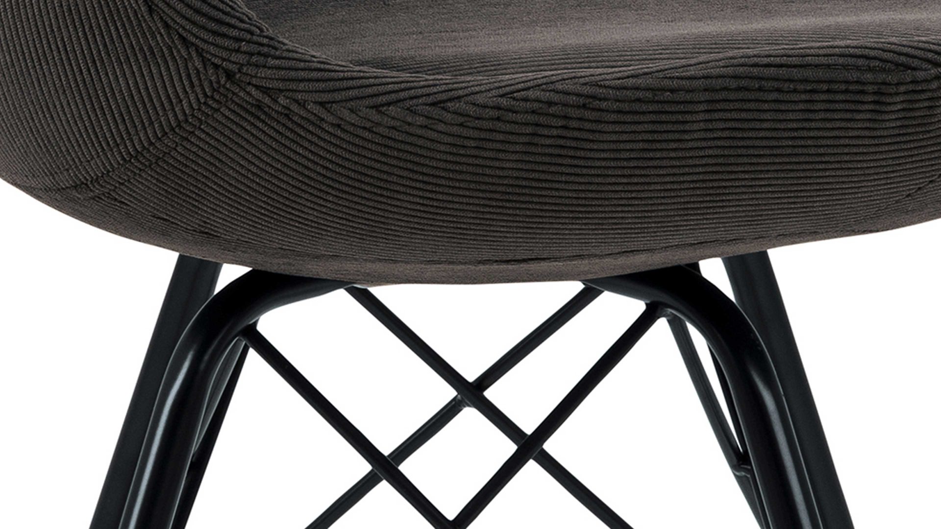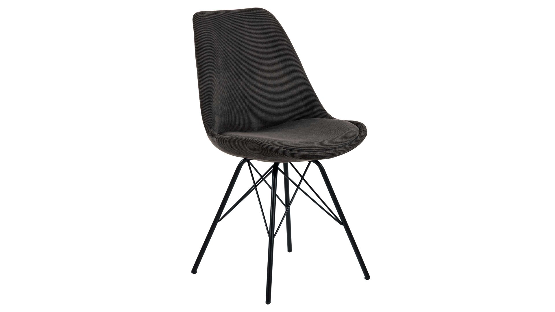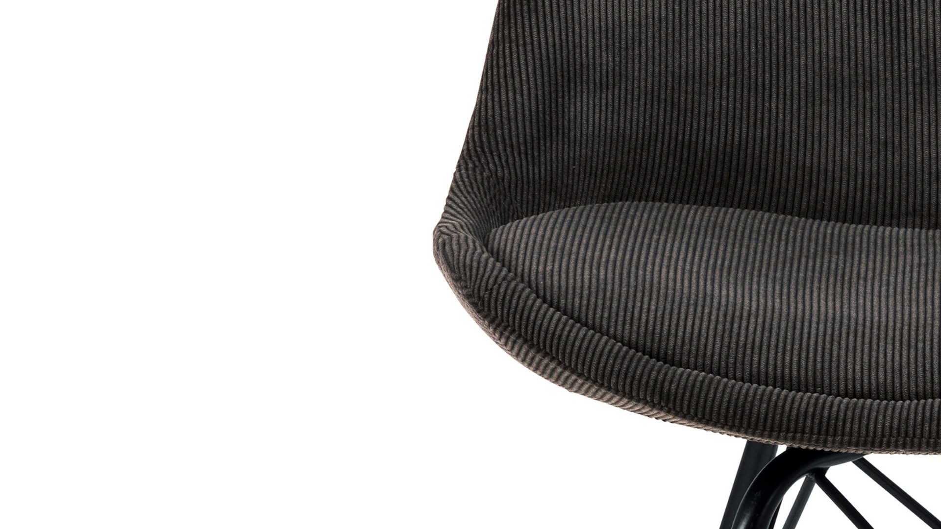 Als stabile, dabei aber wunderbar filigran designte Basis fungiert ein mattschwarz pulverbeschichtetes Stahldrahtgestell. Darauf befindet sich eine anthrazitfarbene Sitzschale aus robustem Kunststoff. Sie ist rundherum mit Feincord bezogen, ebenfalls in Anthrazit. Der angesagte Feincordbezug überzeugt sowohl qualitativ als auch optisch und haptisch.