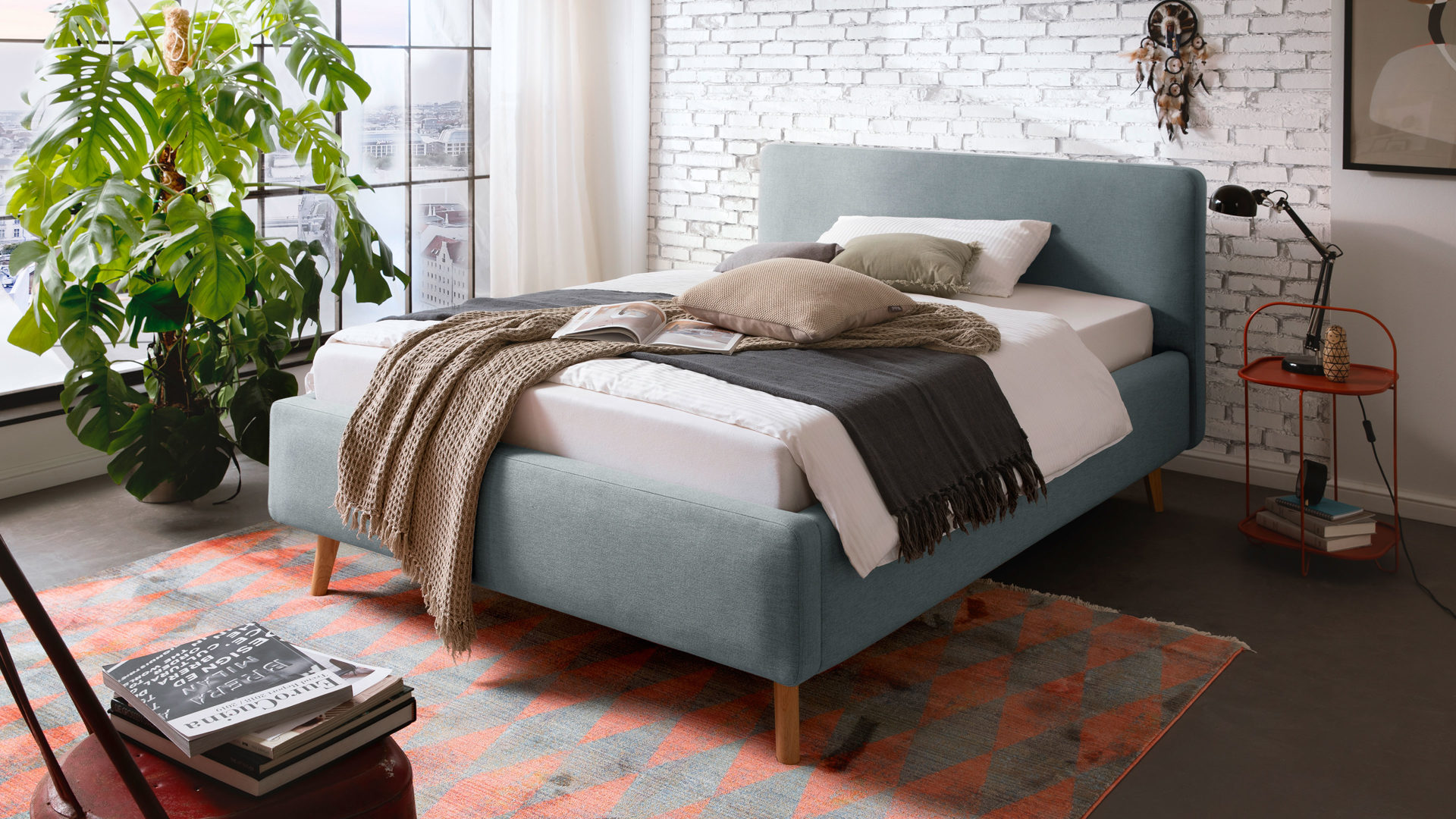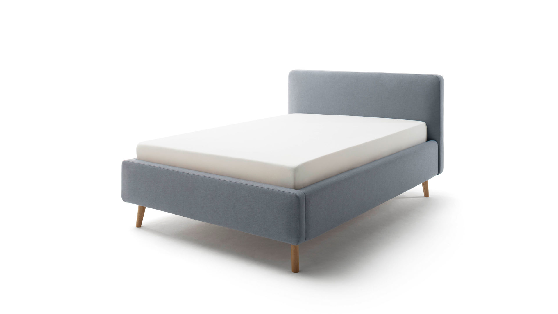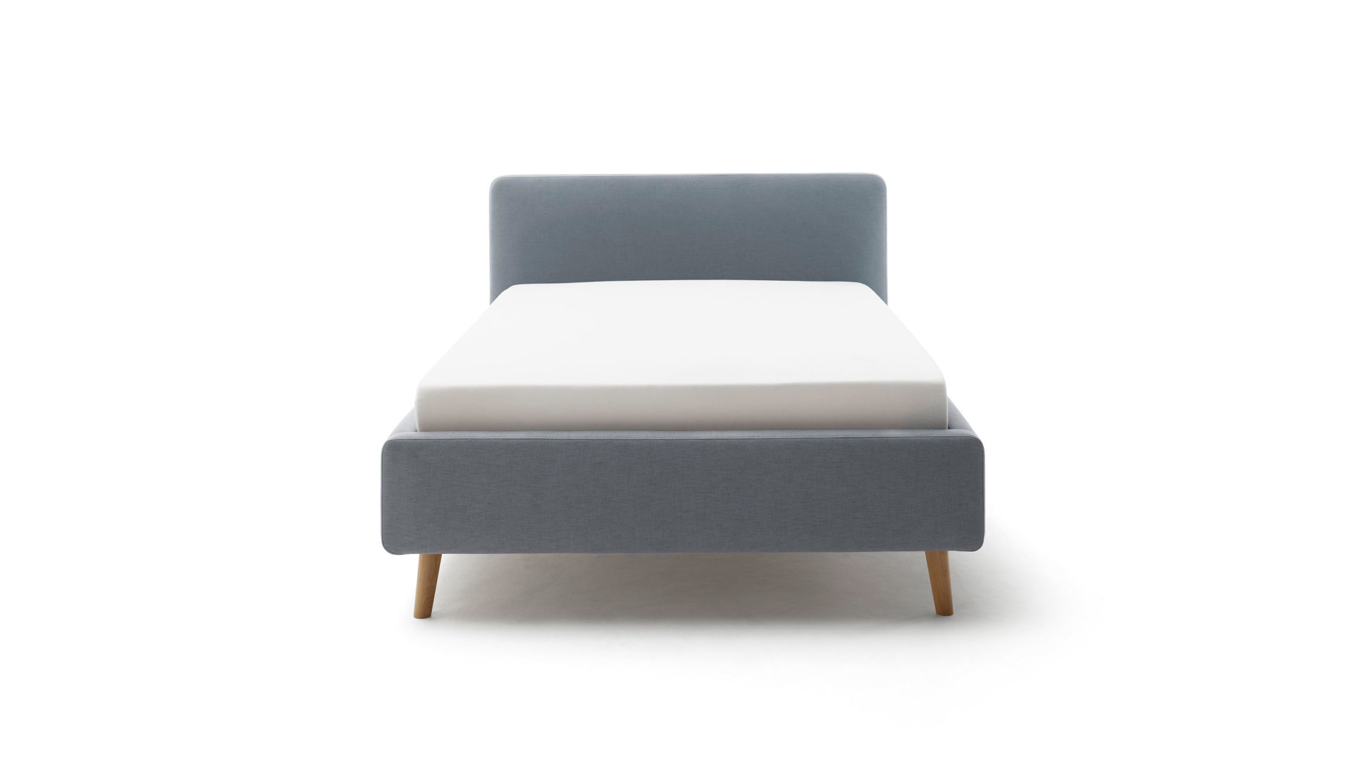 Das Polsterbettgestell Mattis begeistert durch die elegante Optik sowie die hervorragende Material- und Verarbeitungsqualität. Es kombiniert einen eisblaues Flachgewebe-Bezug mit eichefarbenen Holzfüßen. Sowohl die Bettseiten als auch das Polsterkopfteil sind glatt bezogen. Letzteres lädt Sie ein, sich anzulehnen, wenn Sie abends im Bett vor dem Schlafen noch fernsehen oder in einem Buch lesen.