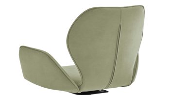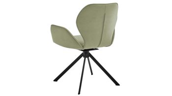 Er kombiniert ein mattschwarz lackiertes Stativgestell aus robustem Eisen mit einem lindgrünen Mikrofaserbezug in Lederoptik und fügt sich in verschiedene Wohnstile harmonisch ein. Zu den optischen Highlights des Esszimmerstuhls gehört neben der Formensprache und den perfekt aufeinander abgestimmten Farben der markante Quereinzug im Rücken. Praktisch begeistern die Drehbarkeit um 180 Grad mit Rückholfunktion sowie die bodenschonenden Gleiter am Gestell.