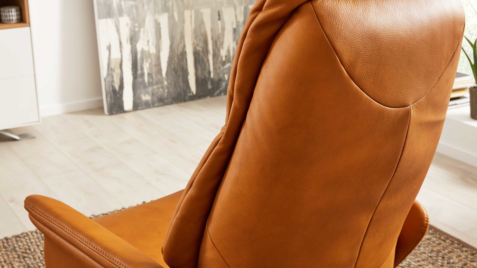 Der Drehsessel aus der Interliving Sessel Serie 4550 verbindet elegantes Design mit hochwertiger Verarbeitung und hohem Komfort. Der kürbisfarbene LongLife-Lederbezug verleiht dem Sessel eine warme, wohnliche Ausstrahlung, während der anthrazitfarben pulverbeschichtete Tellerfuß für einen modernen, stabilen Auftritt sorgt.