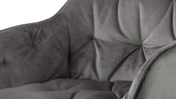 Dabei harmoniert der Polsterstuhl in seiner sanften Formensprache mit zahlreichen Einrichtungsstilen. Moderne Geradlinigkeit ergänzt er ebenso stimmig wie den beliebten Vintage-Trend. Auch farblich erlaubt der Esszimmerstuhl Brooke angenehme Freiheit beim Kombinieren: Dafür sorgt der dunkelgraue Bezug aus Samt, der die gesamte Sitzschale inklusive der bequemen Armlehnen weich umhüllt. Die rau pulverbeschichteten Metallfüße fließen in mattem Schwarz stimmig in das Gesamtbild ein.