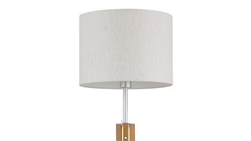 naturfarbenes Leinen und Holz, matt nickelfarbenes Metall und opalweißer Kunststoff