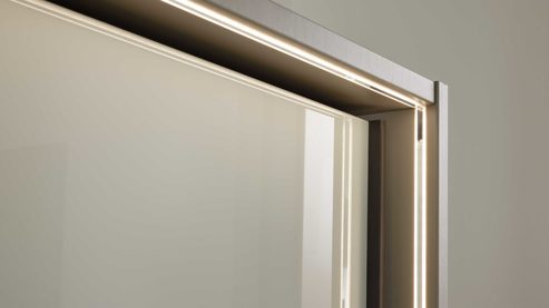 Im Lieferumfang enthalten ist das Passepartout (Typ 006657) mit umlaufender LED-Beleuchtung (Typ 006862). Die fest verbauten LED-Leuchtmittel der Energieeffizienzklasse F (Spektrum A bis G) werden bequem über einen Fußtrittschalter mit 180 cm Zuleitungskabel bedient und sorgen für eine atmosphärische Lichtstimmung.