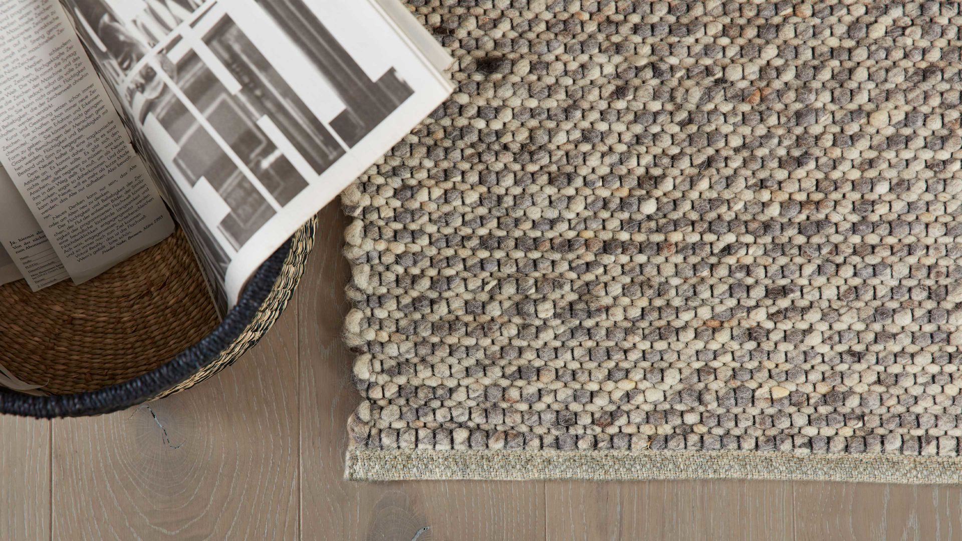 Die Nutzschicht besteht zu 100 % aus gewalkter Schurwolle, die Rückseite aus 55 % gewalkter Schurwolle und 45 % Jute. Beide Materialien sind nachhaltig, strapazierfähig und fördern ein angenehmes Raumklima. Der Teppich ist traditionell in Europa handgewebt und überzeugt durch seine feine Struktur und langlebige Verarbeitung.