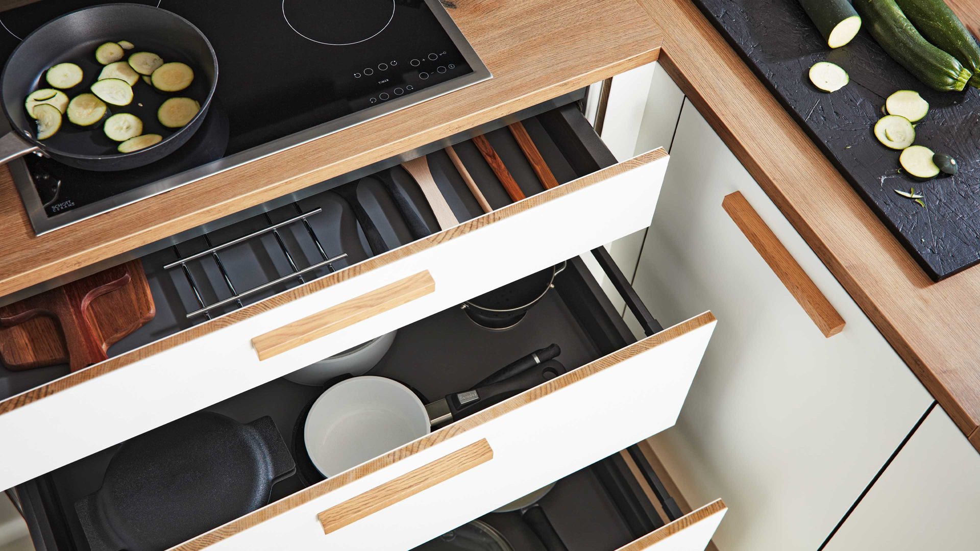 Interliving Küche Serie 3043 – moderner Mix aus Weiß und Vulkaneiche