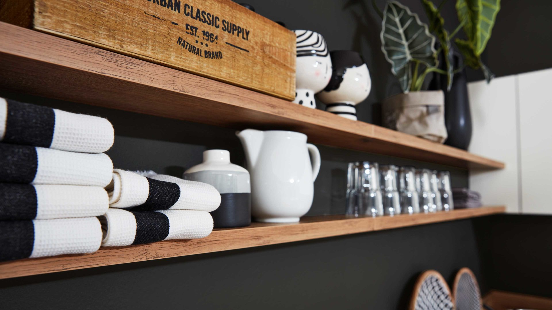 Die Interliving Küche Serie 3043 verbindet elegante Schlichtheit mit natürlichem Charme. Ihre softmatten weißen Fronten harmonieren perfekt mit der warmen Vulkaneiche-Nachbildung, die sich in Arbeitsplatten, Nischenrückwänden, Griffen und Regalen wiederfindet. Korpusse und Sockelblenden in klassischem Weiß setzen helle Akzente, während die grifflosen Oberschränke das puristische Design abrunden.