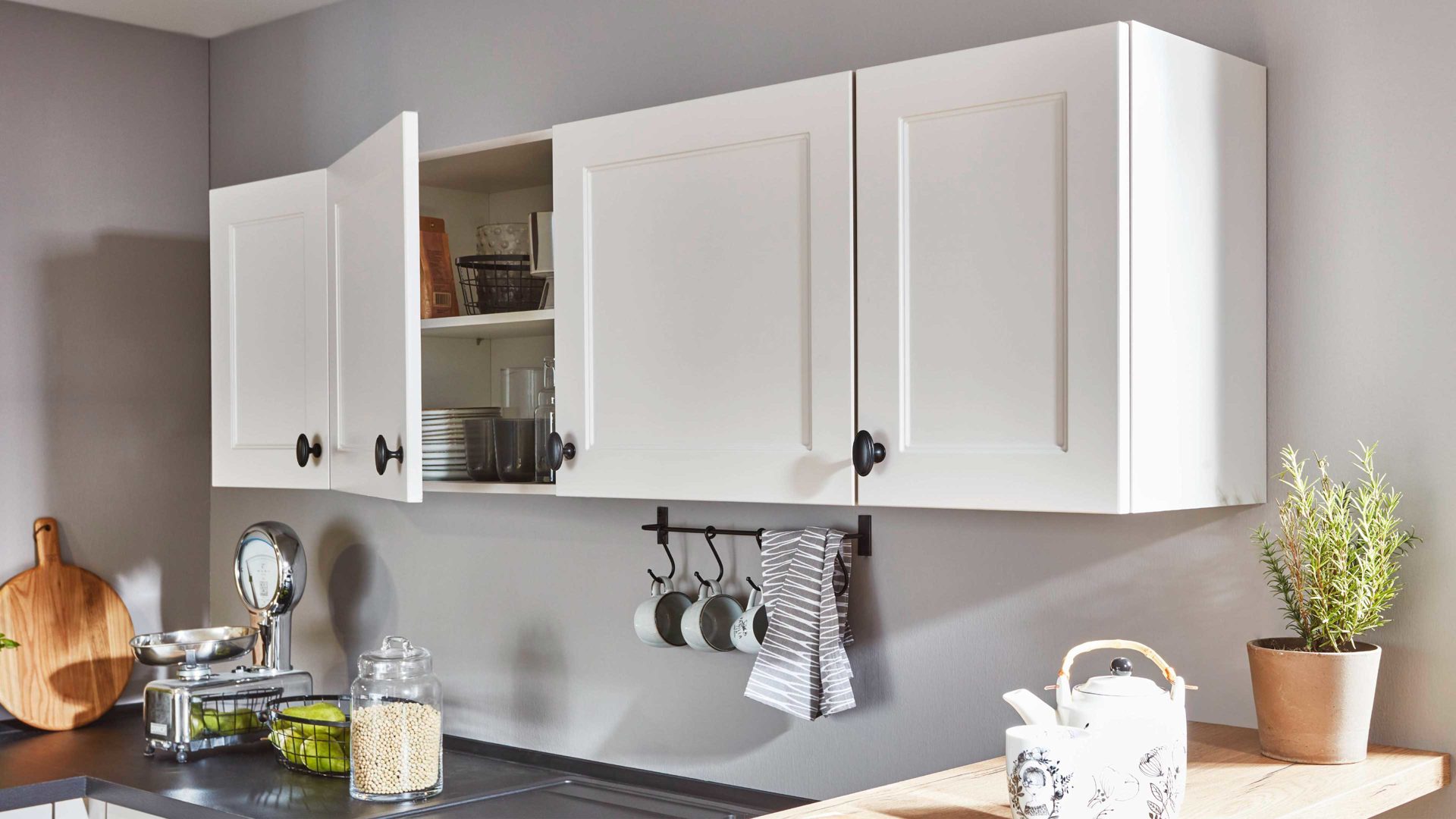 matte magnolienfarbene Fronten mit schwarzen Metall-Knopfgriffen und magnolienfarbene Korpusse