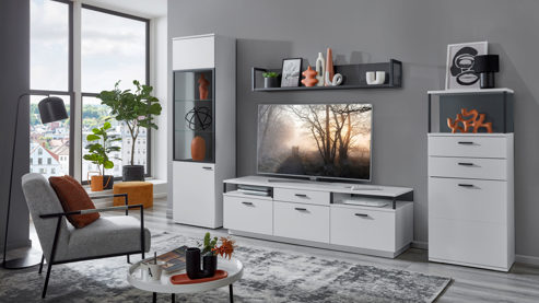 • Die Abbildung zeigt ein Wohnbeispiel, welches auch Dekoration sowie separat erhältliches Zubehör enthält. Im Lieferumfang enthalten ist eine Wohnwand.