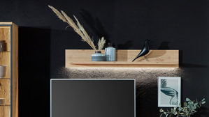 • Die Abbildung zeigt ein Wohnbeispiel, welches auch Dekoration sowie separat erhältliches Zubehör enthält. Im Lieferumfang enthalten ist ein Wandregal.