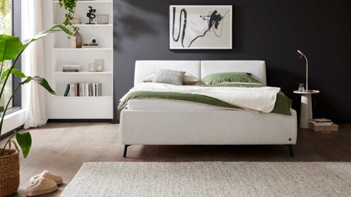 • Die Abbildung zeigt ein Wohnbeispiel, welches auch Dekoration sowie separat erhältliches Zubehör enthält. Im Lieferumfang enthalten ist ein Polsterbettgestell mit Kopfteilverstellung.